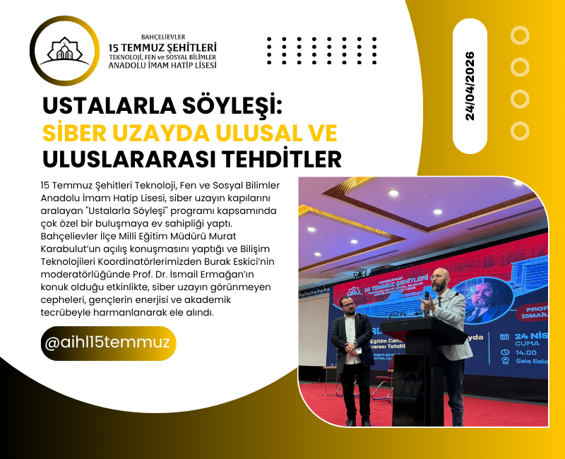 15 Temmuz Şehitleri Teknoloji, Fen ve Sosyal Bilimler Anadolu İmam Hatip Lisesi, siber uzayın kapılarını aralayan “Ustalarla Söyleşi” programı kapsamında çok özel bir buluşmaya ev sahipliği yaptı. Bahçelievler İlçe Milli Eğitim Müdürü Murat Karabulut’un açılış konuşmasını yaptığı ve Bilişim Teknolojileri Koordinatörlerimizden Burak Eskici’nin moderatörlüğünde Prof. Dr. İsmail Ermağan’ın konuk olduğu etkinlikte, siber uzayın görünmeyen cepheleri, gençlerin enerjisi ve akademik tecrübeyle harmanlanarak ele alındı.