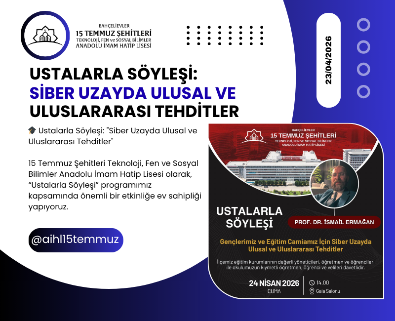 15 Temmuz Şehitleri Teknoloji, Fen ve Sosyal Bilimler Anadolu İmam Hatip Lisesi olarak, “Ustalarla Söyleşi” programımız kapsamında önemli bir etkinliğe ev sahipliği yapıyoruz.